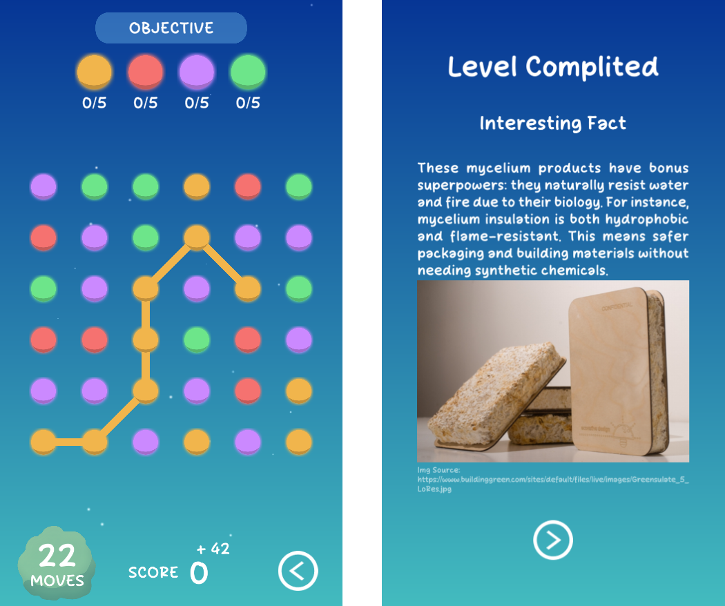 Complete levels to unlock fascinating facts about how mycelium is revolutionizing industries and helping us save the planet.